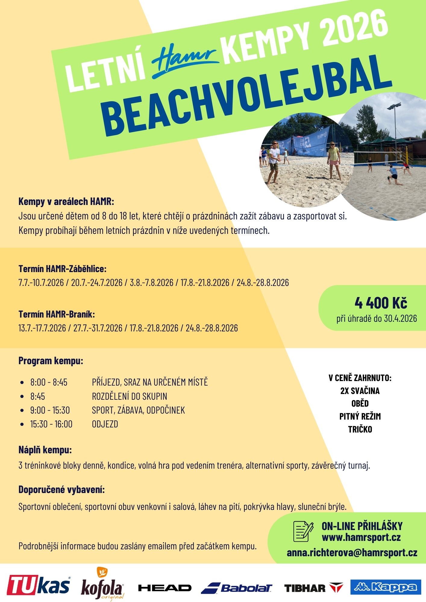 - Cena přihlášky při úhradě do 30.4.2026: 4 400 Kč (3 600 Kč pro 4 denní kemp v termínu 7.-10.7.)