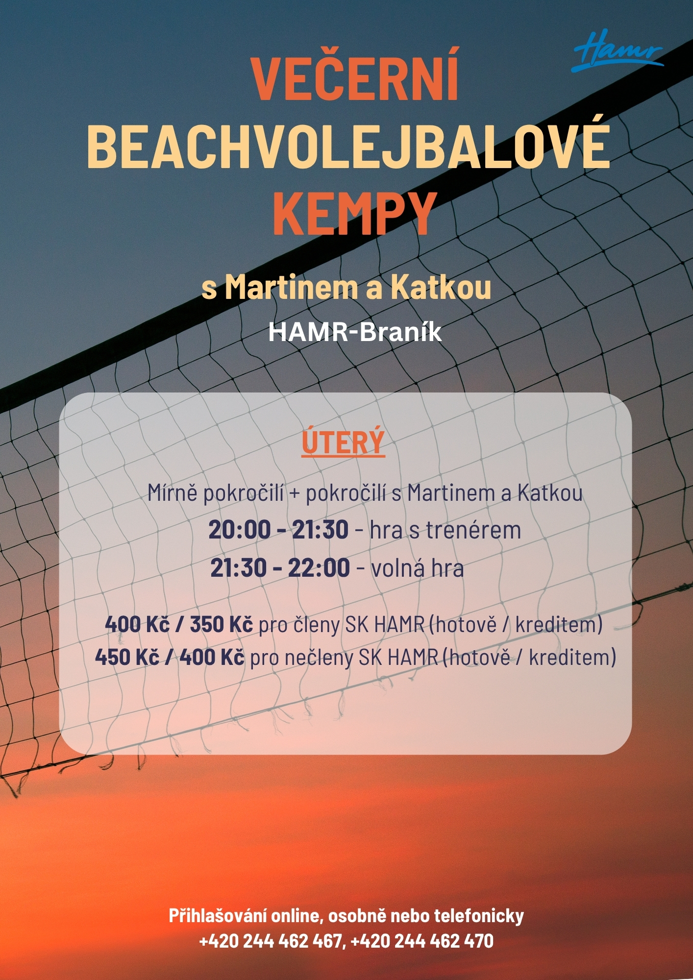 - Beachvolejbal je možné hrát ve dvou sportovních areálech. V Záběhlicích (+420 272 772 762) je šest kurtů a v areále na Braníku (+420 244 462 470) nabízíme pět hřišť.